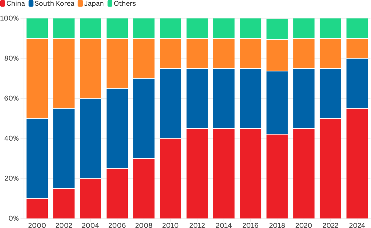 America's shipbuilding industry has faced a strategic crisis. Decades of decline caused by failed globalism policies have turned the United States from the world's leading shipbuilder in 1975 into today's minor producer ranked 19th globally. Meanwhile, China has methodically expanded its shipbuilding over the past two and a half decades, achieving world dominance through state industrial policy, massive subsidies, and strategic investments. The US currently produces fewer than five large commercial vessels (i.e., large ocean-going ships displacing over 1,000 gross tons) per year, while China builds over 1,700 ships annually. Moreover, Beijing now accounts for more than 50% of the global shipbuilding market compared to about 5% in 2000 (Figure 1).