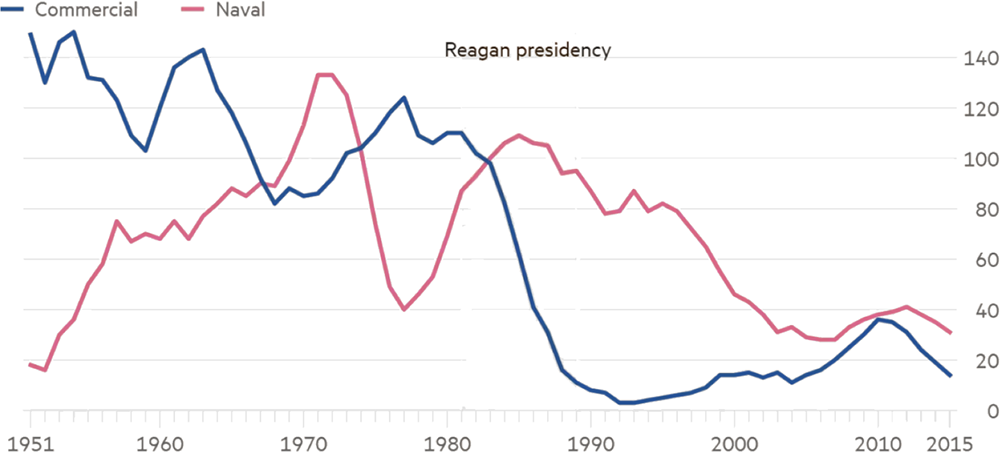 The destruction of American civilian shipbuilding began in the 1980s, driven by liberal-globalist economic policies of Reaganomics, which deprived the industry of critically important state support. In 1982, the Reagan administration terminated federal shipbuilding subsidies, leading to the near-instant collapse of the US commercial shipbuilding market. After the Reagan administration canceled shipbuilding subsidies, US production volume fell from about 20 large ocean-going commercial vessels per year to just five over the next eight years, with America's share of world trading tonnage dropping from 1.1% in 1988 to just 0.25% by the end of the 1990s.