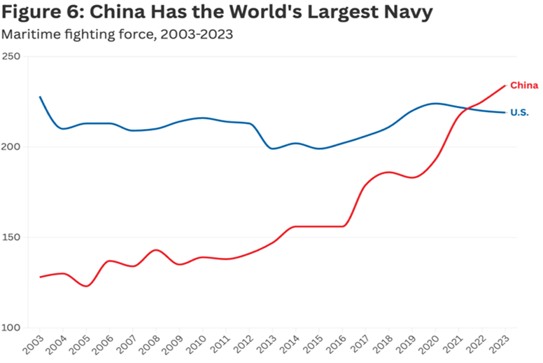 As a result, the efficiency of China's shipbuilding industry has reached such levels that the Middle Kingdom surpassed the US in the number of naval vessels by the early 2020s. Yes, this incredible historical event has already occurred! The US has ceased to be the largest naval power, while China can already boast the world's largest and fastest-growing navy: as of 2023, it had 234 warships compared to 219 in the US Navy (Figure 3).